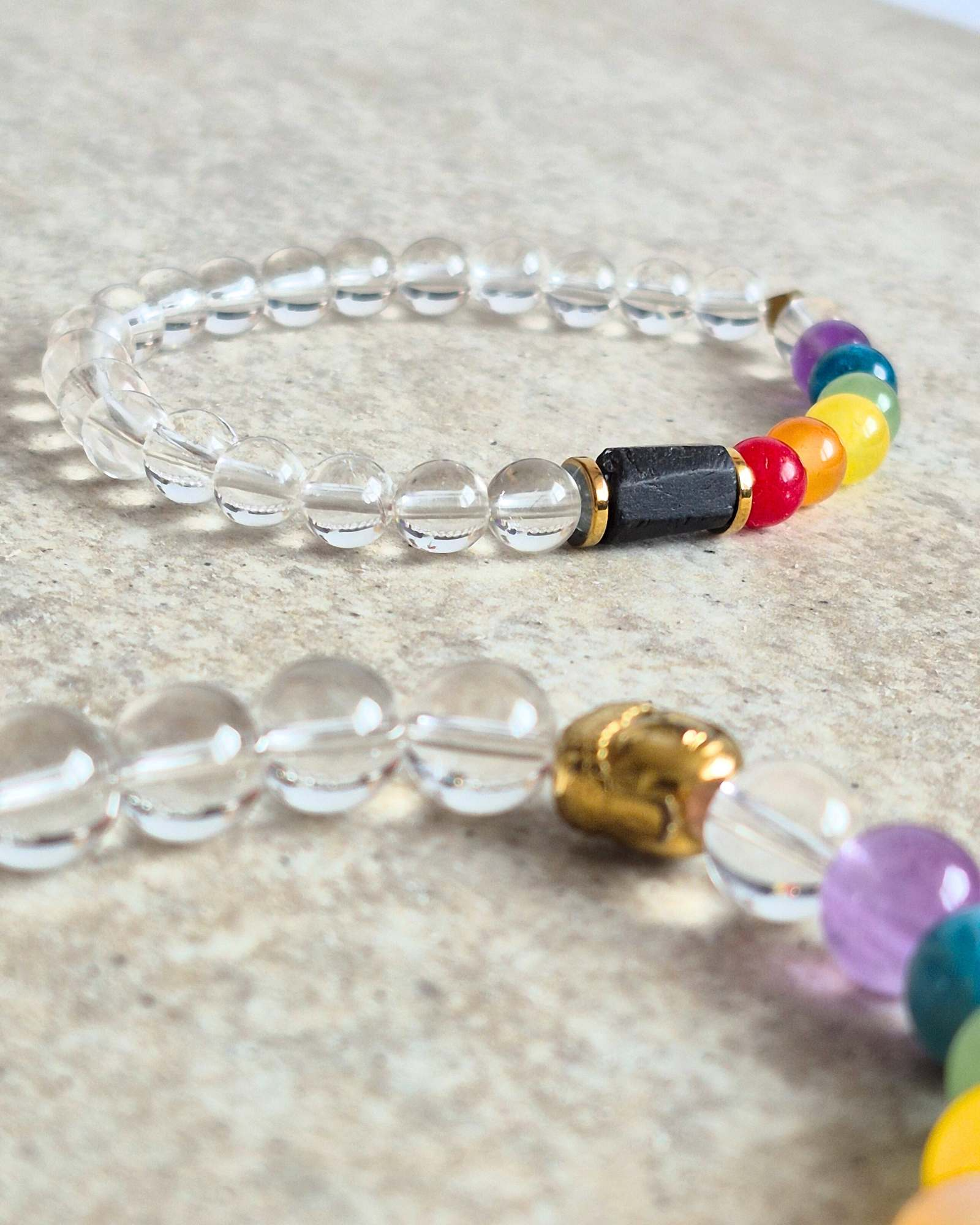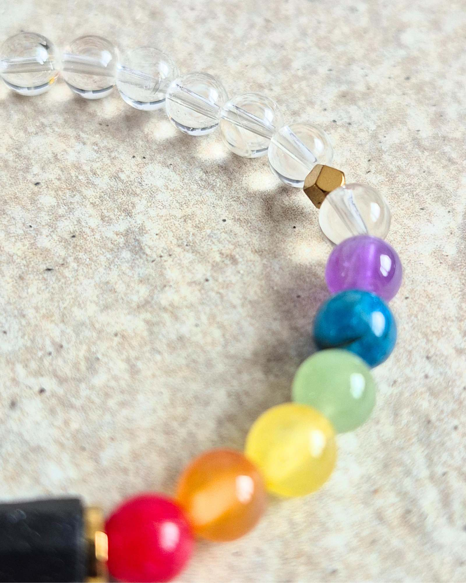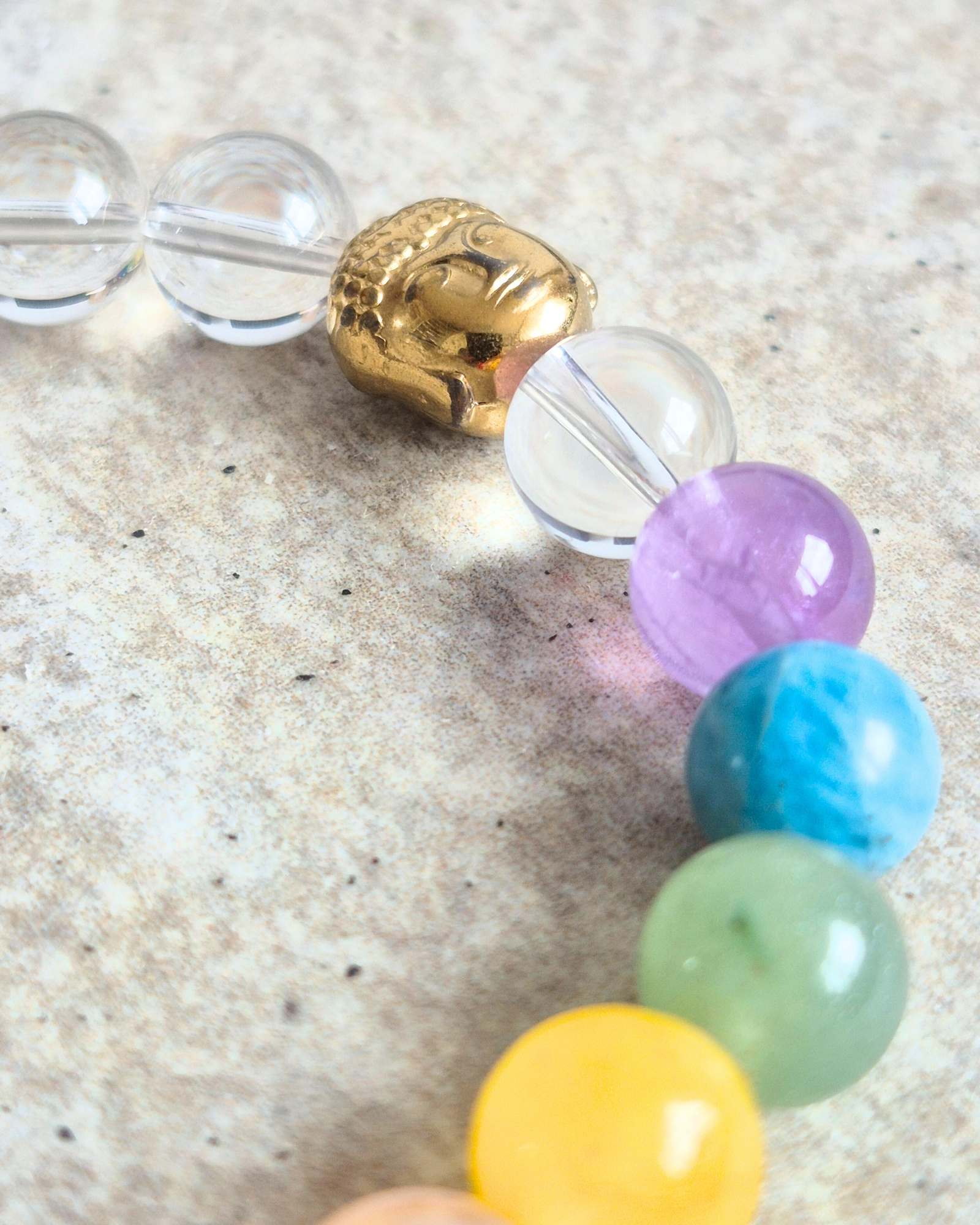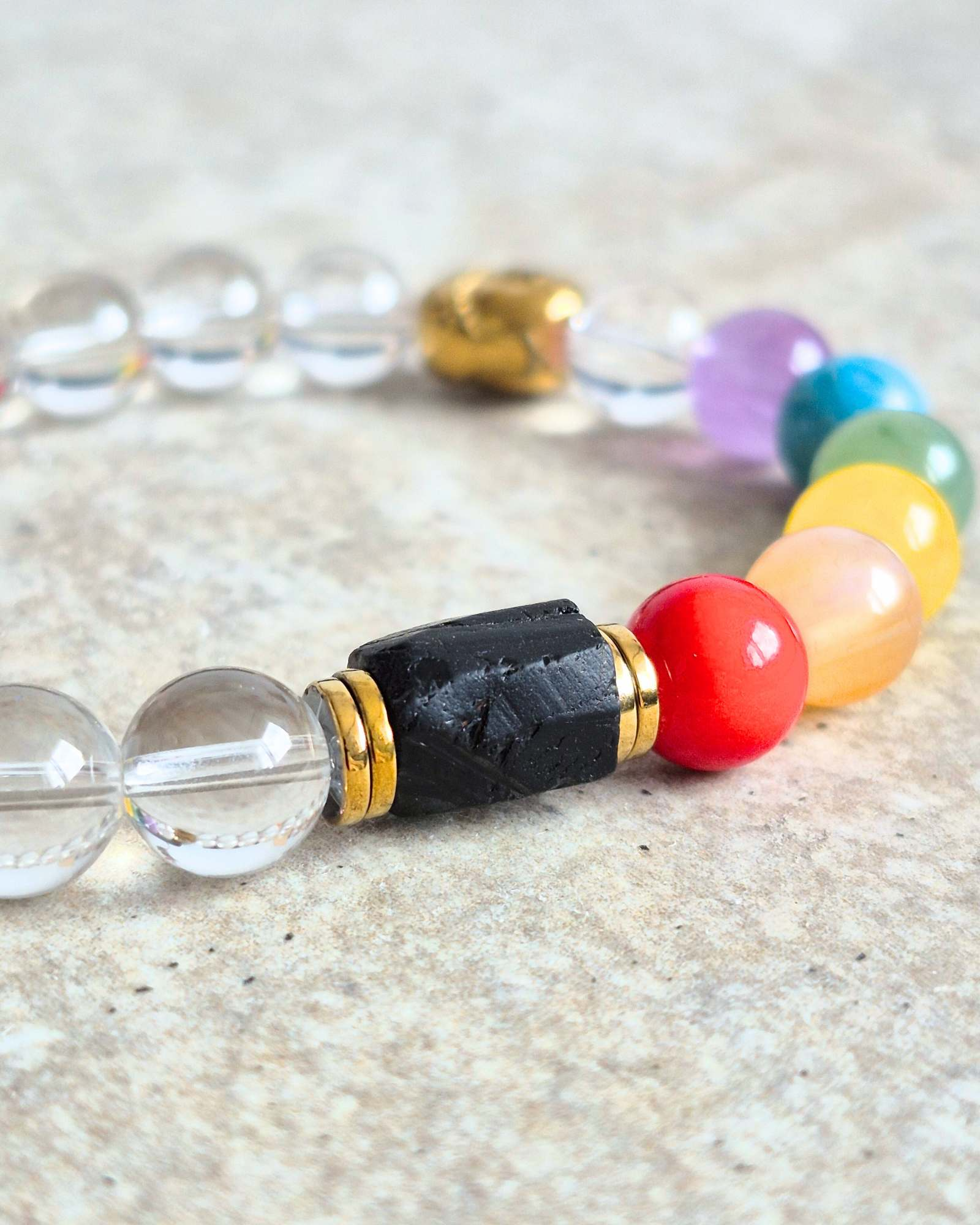 W bransoletce znajdują się kolorowe kamienie, takie jak ametyst, awenturyn, jadeit, agat i apatyt, które wspierają różne czakry. Każdy z nich ma swoje unikalne właściwości, które pomagają w osiągnięciu równowagi emocjonalnej i duchowej.