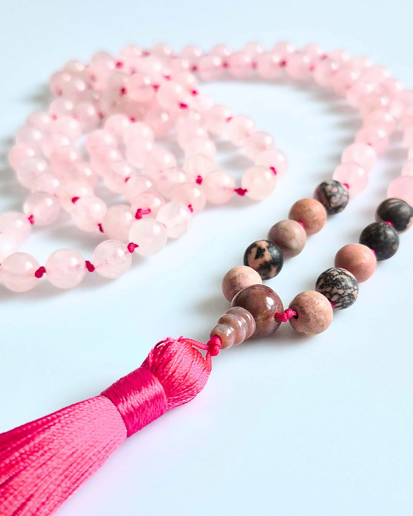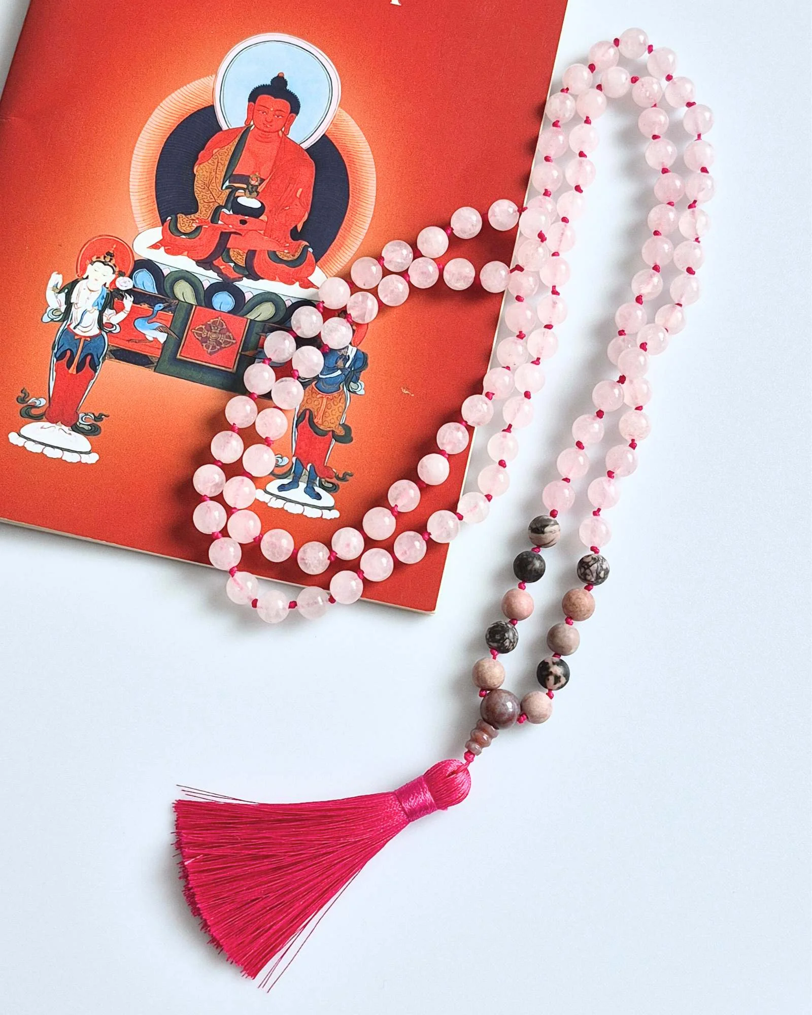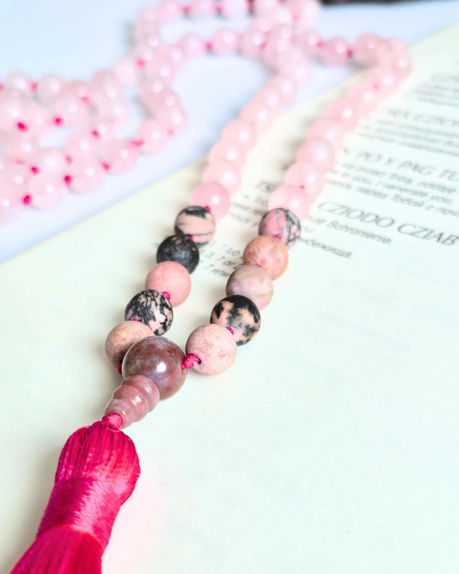 Mala buddyjska z Kwarcu Różowego i Rodonitu – duchowa praktyka z przestrzenią na serce i miłość