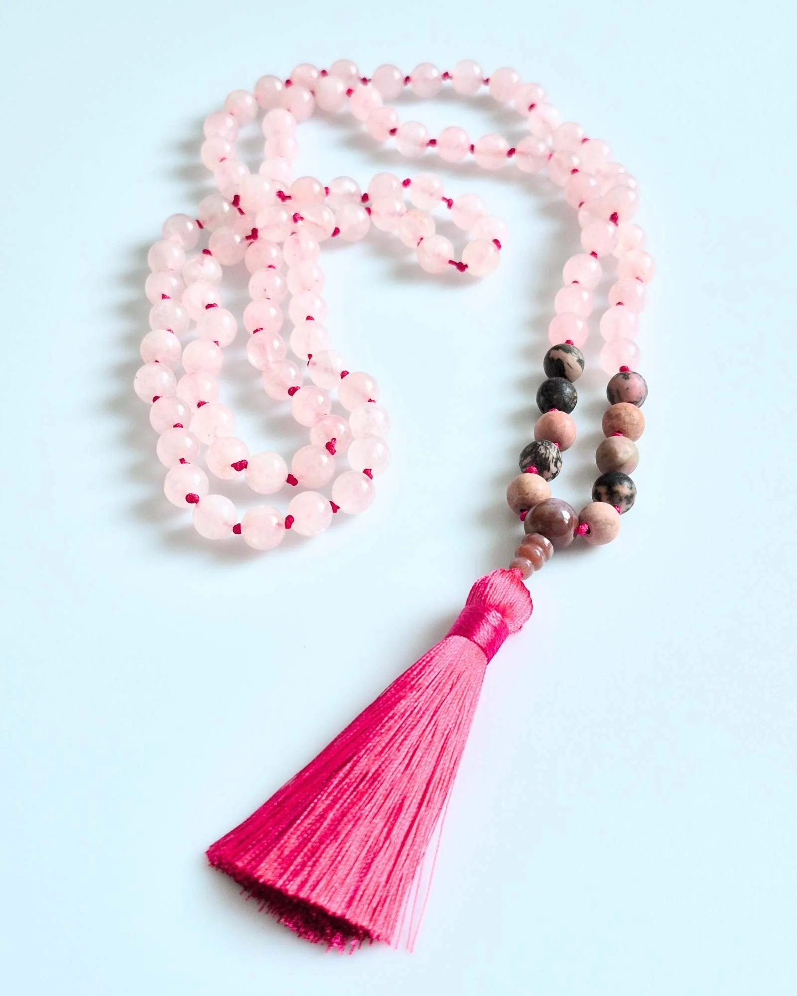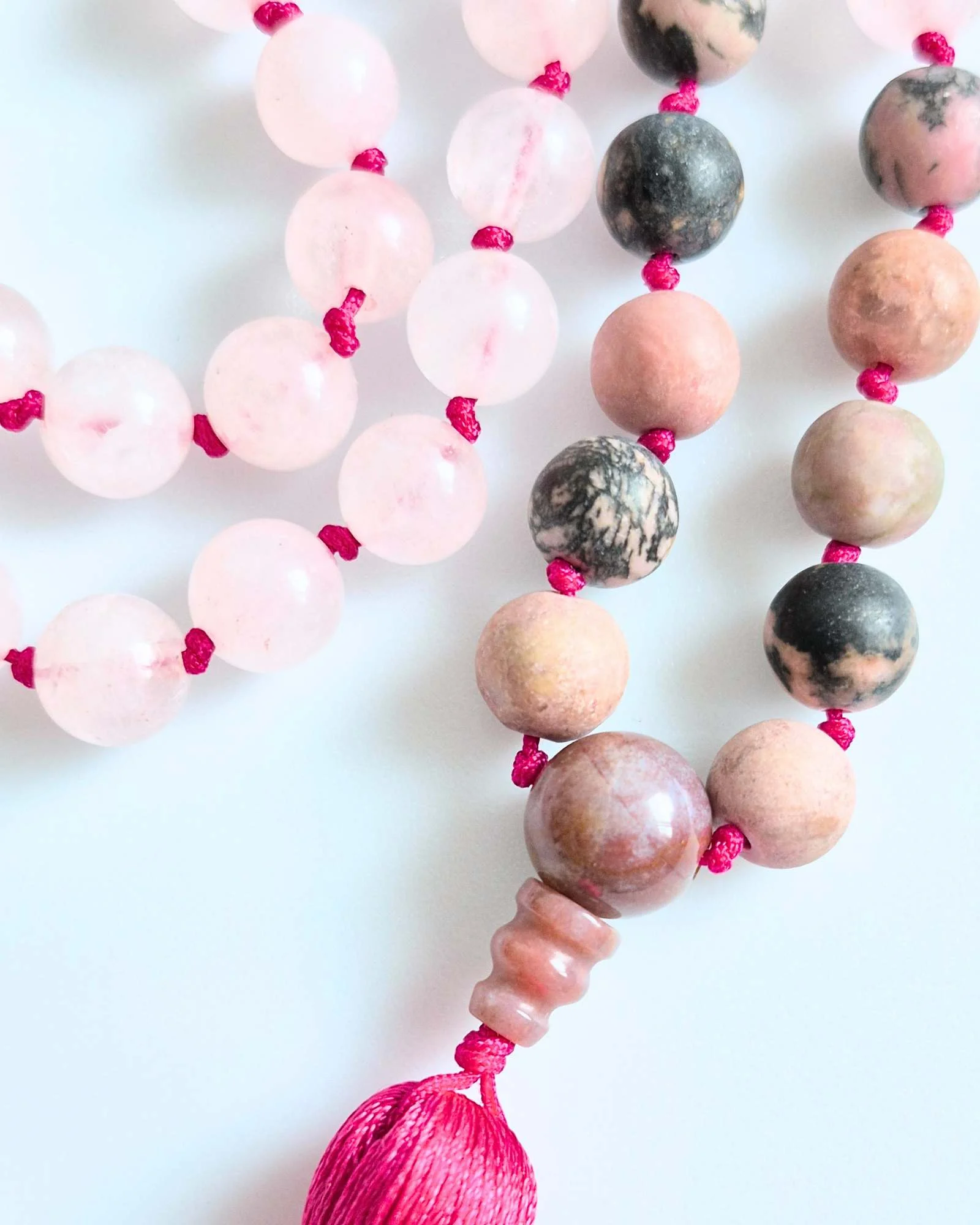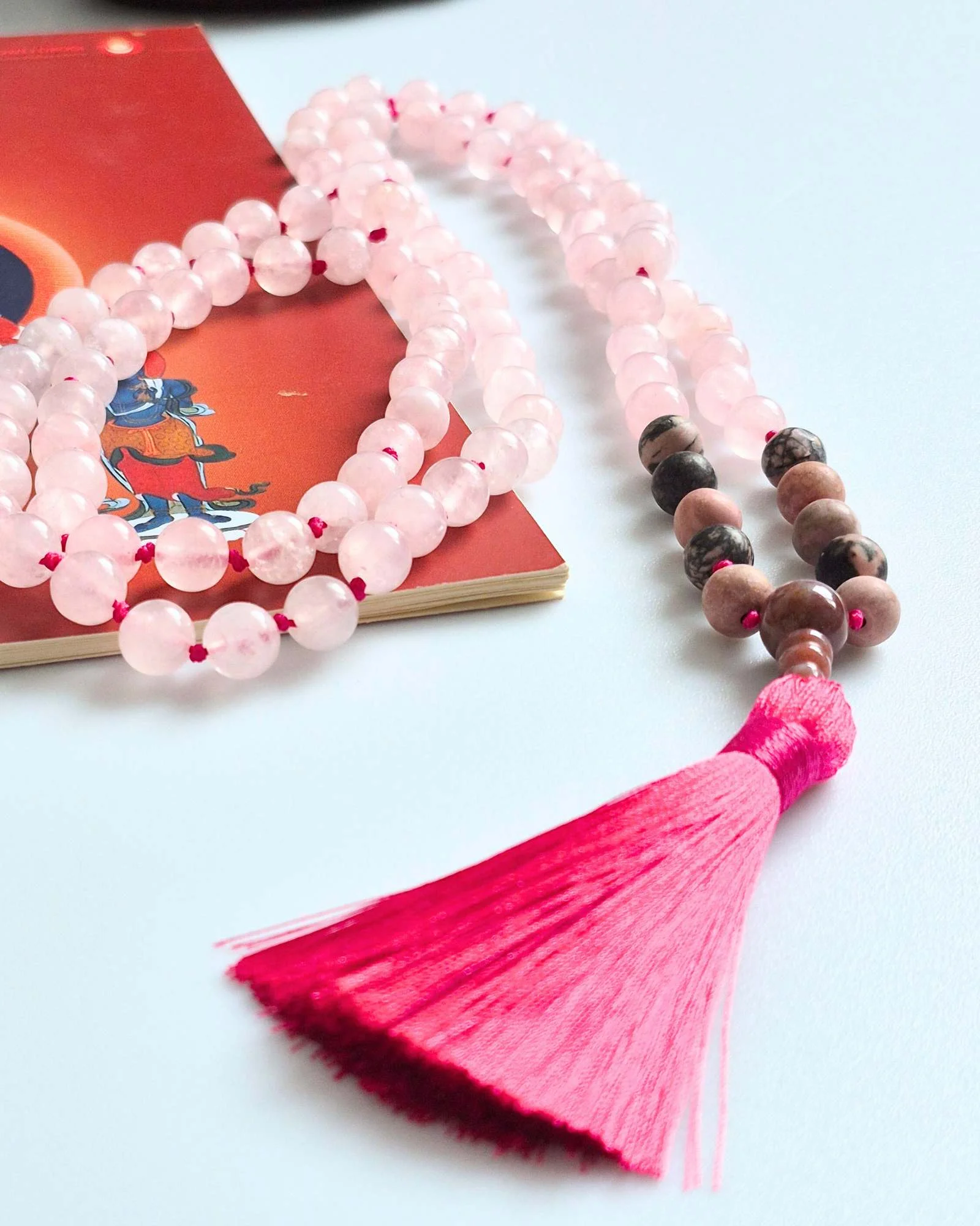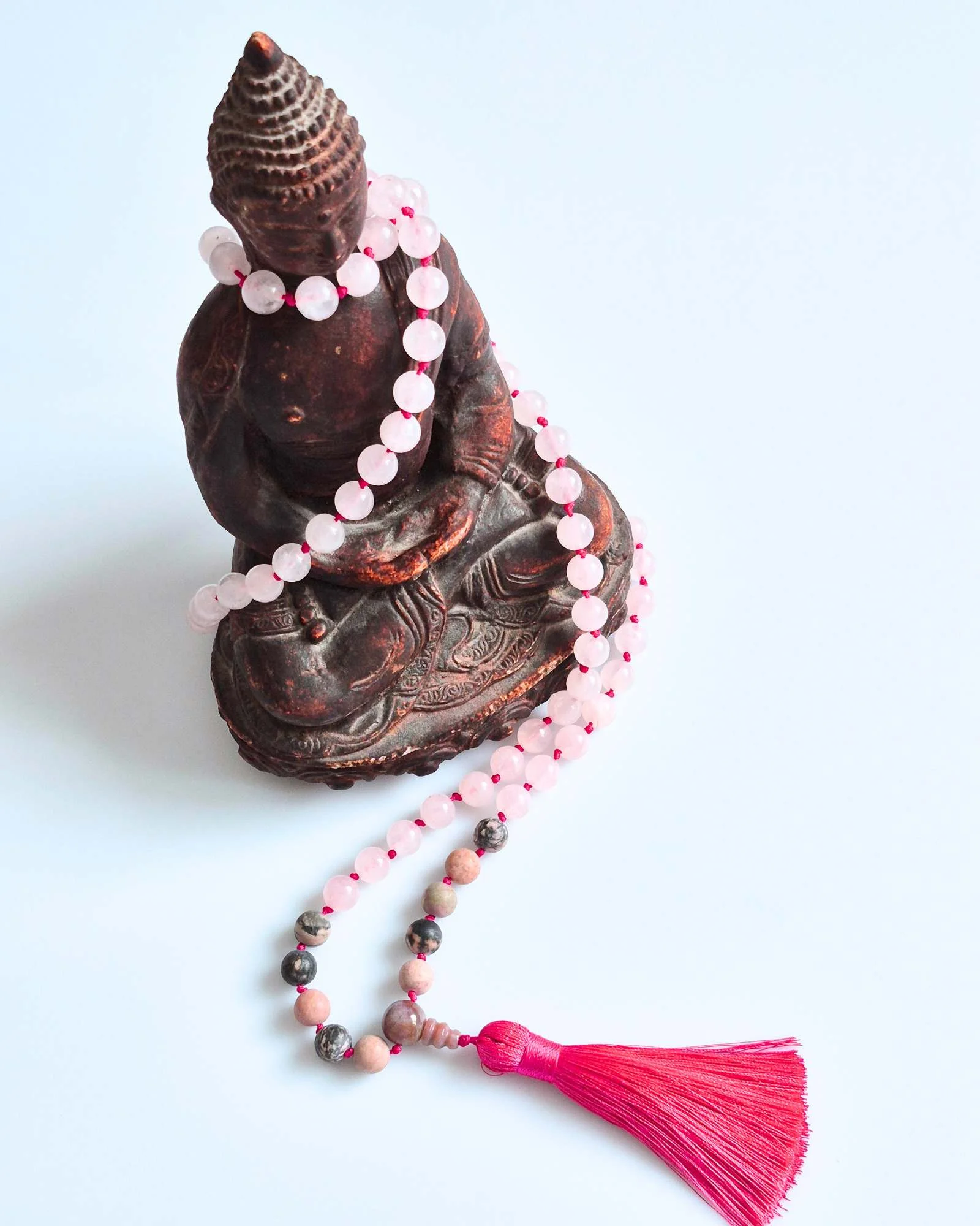Mala buddyjska z Kwarcu Różowego i Rodonitu – duchowa praktyka z przestrzenią na serce i miłość