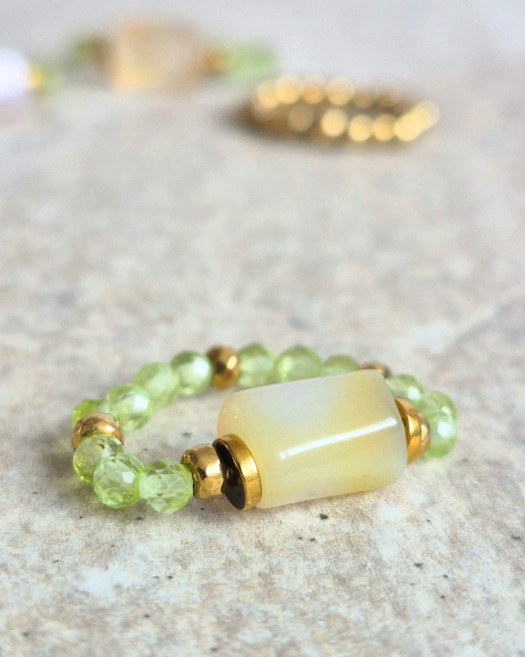 Dodaj blasku swojej dłoni dzięki temu wyjątkowemu pierścionkowi na gumce z agatem i oliwinem, który łączy naturalne piękno kamieni z wygodą codziennego noszenia. W centrum kompozycji znajduje się mleczno-żółty agat – kamień, który emanuje spokojem, równowagą i subtelnym urokiem. Jego gładka powierzchnia i delikatna barwa przyciągają wzrok i idealnie współgrają z resztą kompozycji.