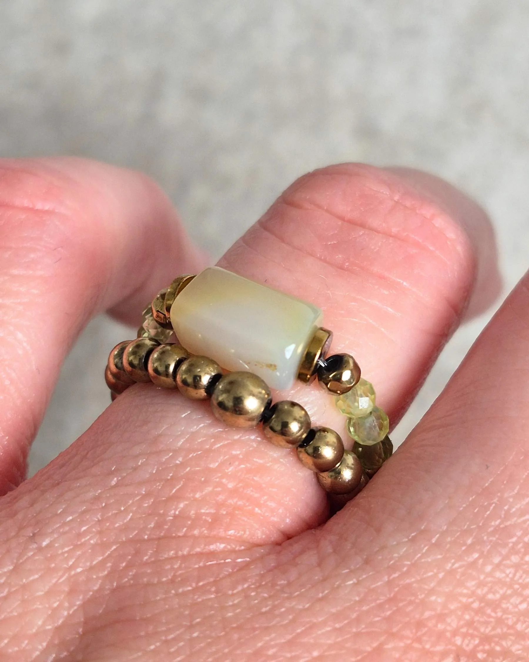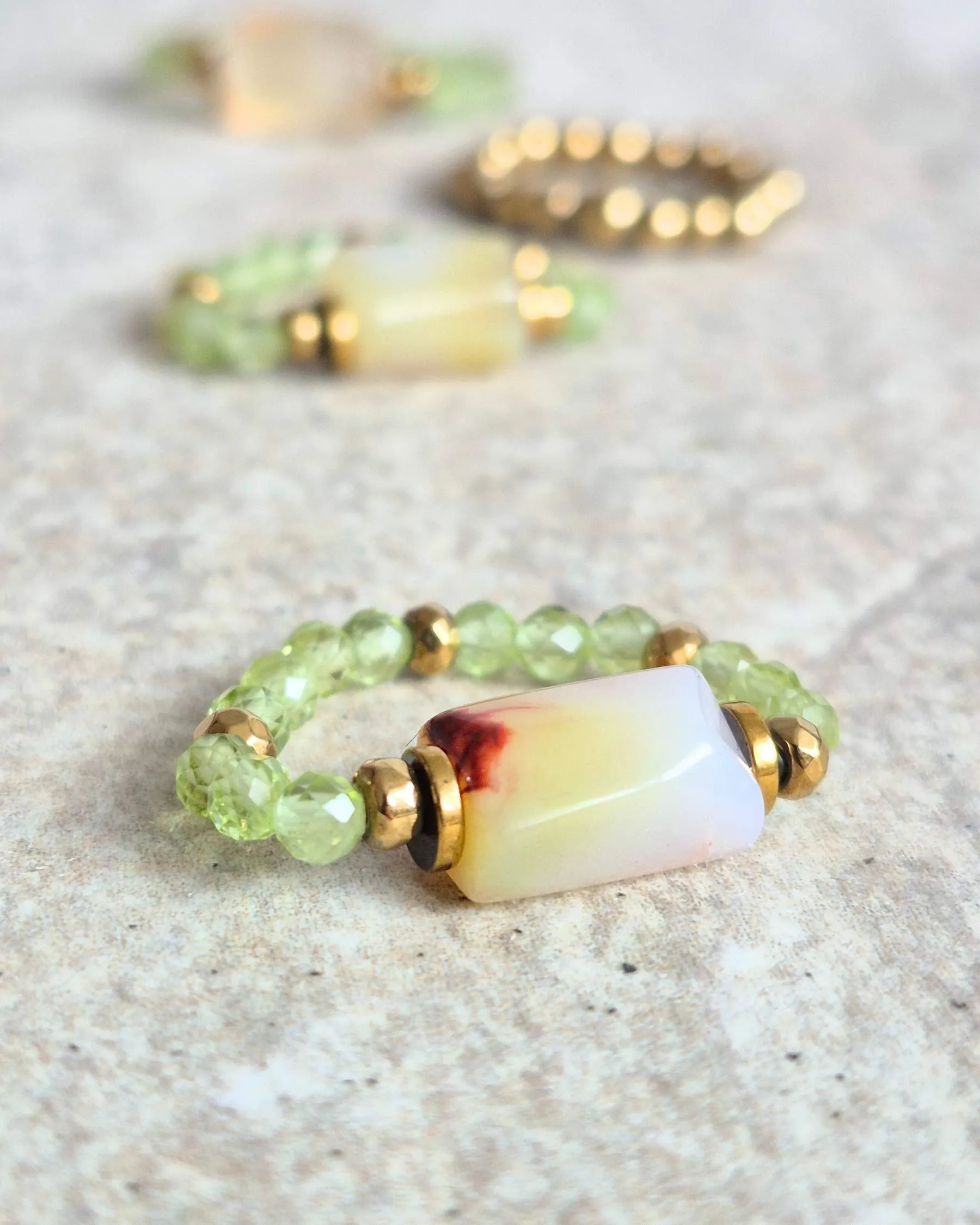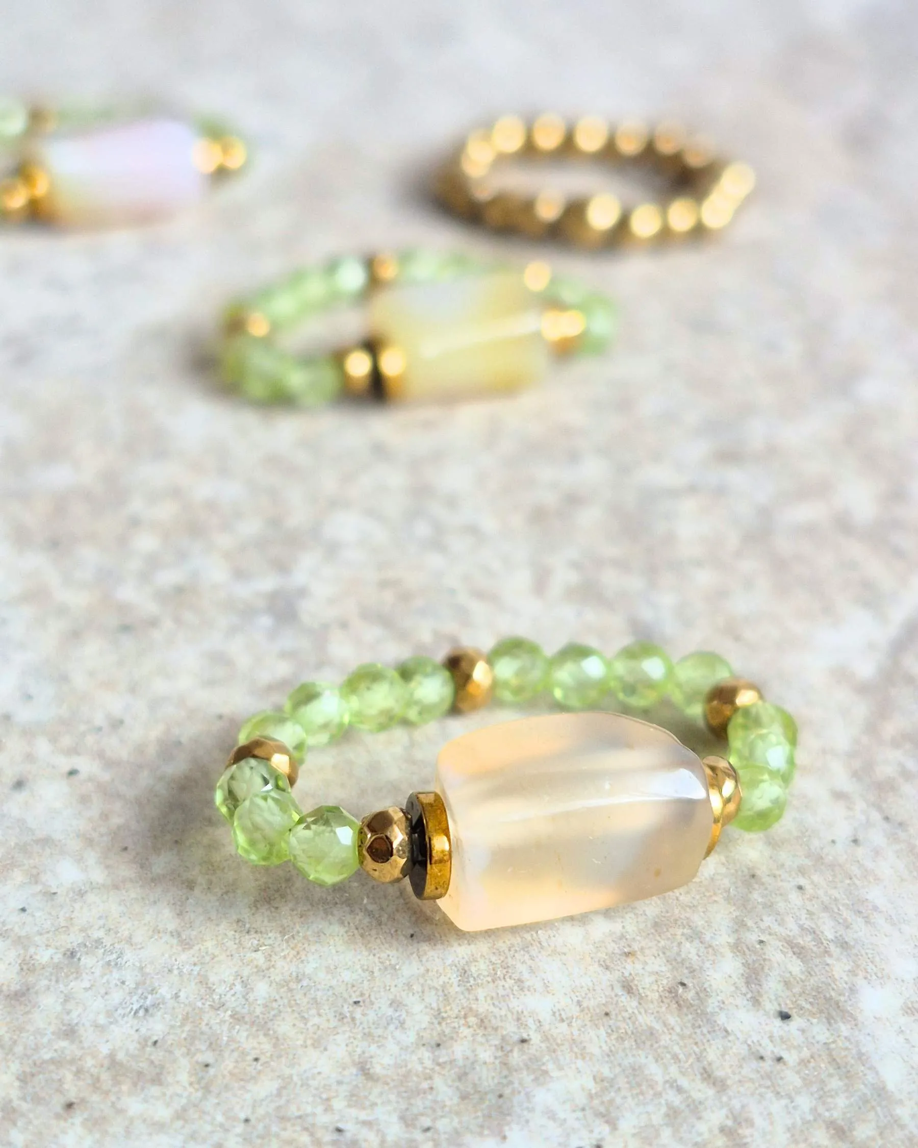 🌿 Pierścionek na gumce z agatem, oliwinem i hematytem – świeżość, lekkość, elegancja