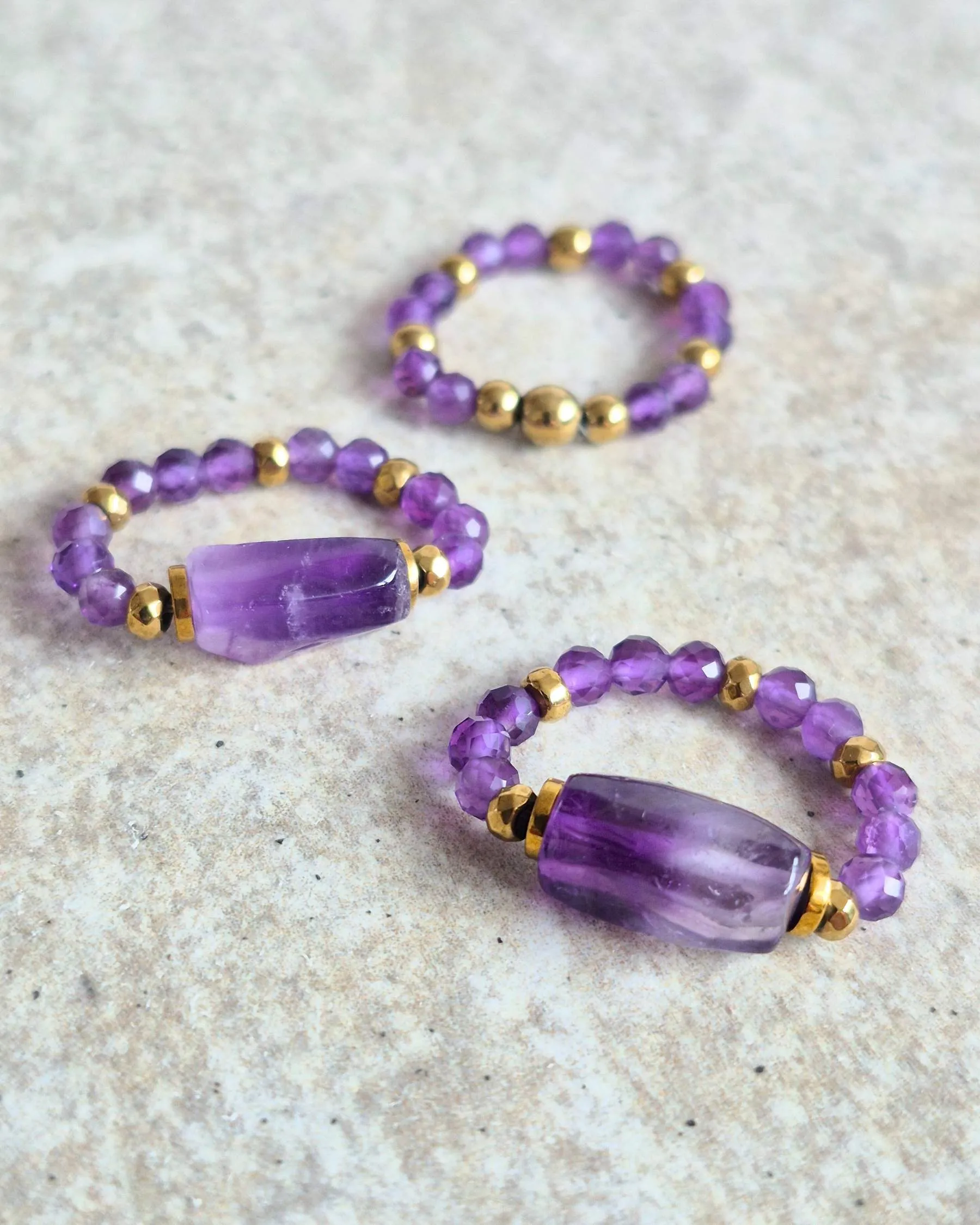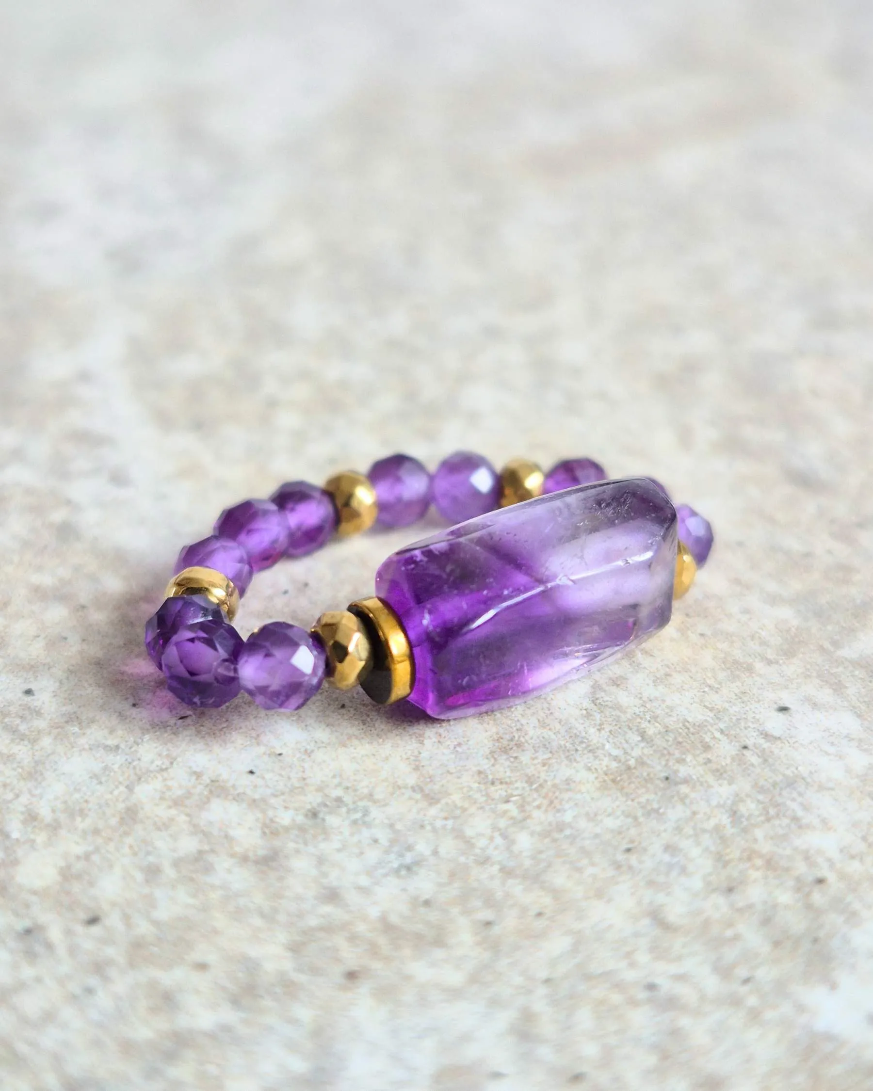✨ Pierścionek na gumce z ametystem i hematytem – fioletowa moc w eleganckiej formie