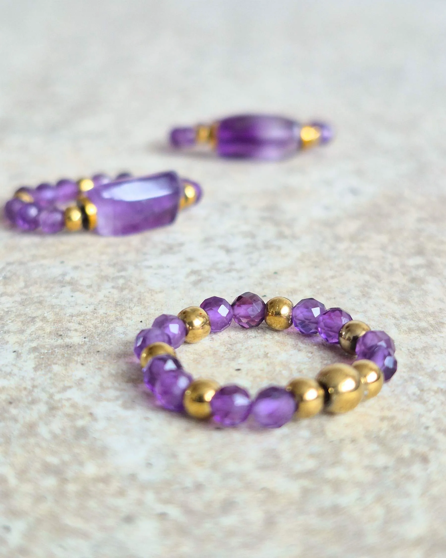 Oto pierścionek na gumce z ametystem, który zachwyca prostotą i wyjątkową energią. Ten delikatny, a jednocześnie wyrazisty dodatek idealnie łączy w sobie styl i znaczenie kamieni naturalnych. Zamiast jednego centralnego kamienia, równomiernie ułożone koraliki z ametystu tworzą spójną, subtelną całość.